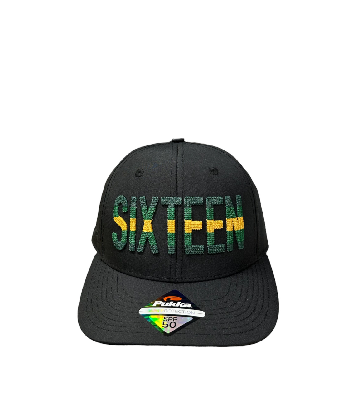 Sixteenth hole sun protection tech fabric hat. Adjustable black hat with gold, dark green, and light green stitching.