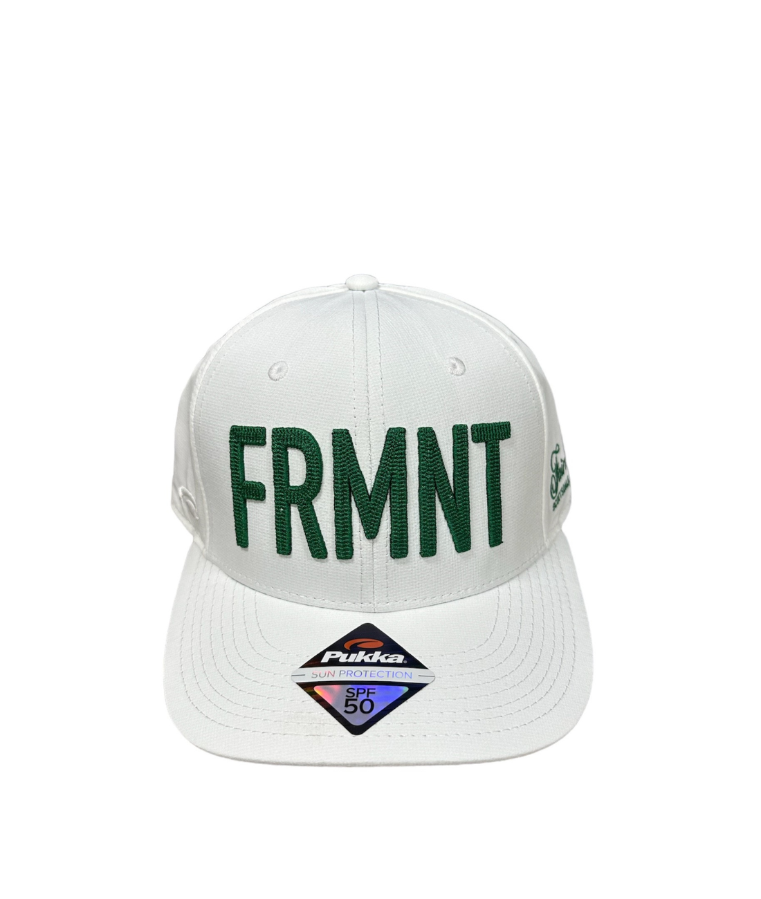 Fairmont Scottsdale Princess sun protection tech fabric hat. Adjustable white hat with dark green stitching.